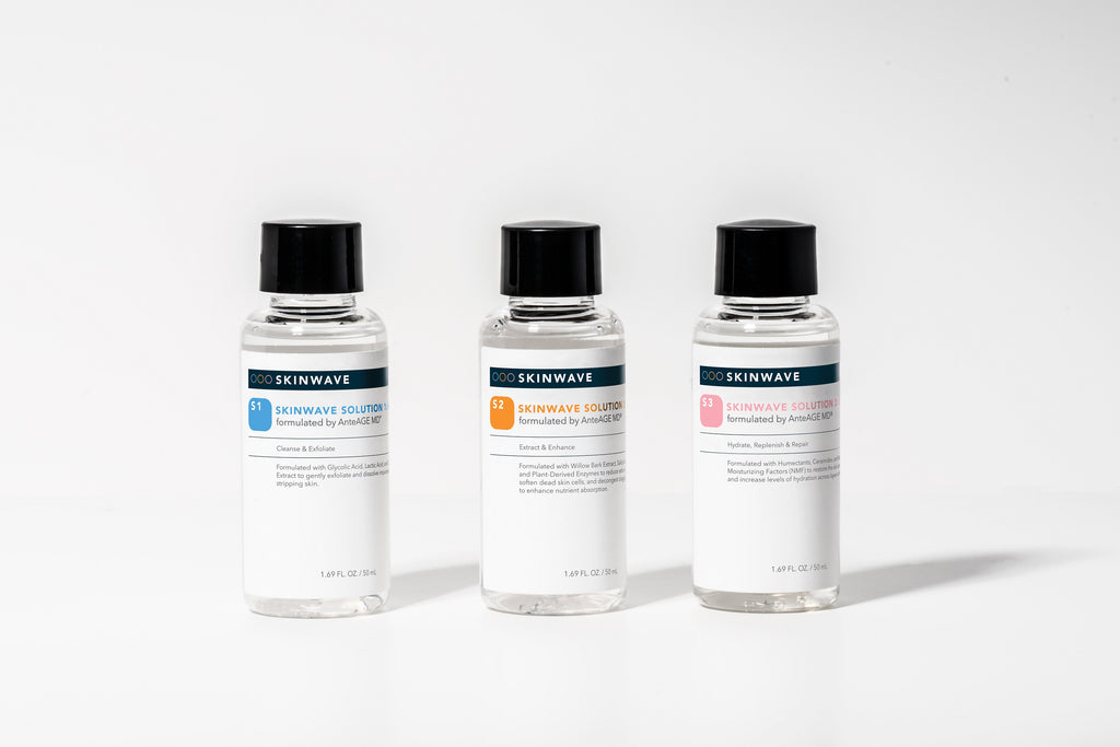 Noon Aesthetics a leader in results orientated, efficacious formulas, developed 3 potent solutions for use with the SKNLAB and SkinWave devices. Begin with S1 to cleanse and exfoliate, this potent formula dissolves impurities without stripping the skin. Formulated with Dermshield® technology, the solution delivers a high concentration of ingredients without causing irritation or side effects. Next, extract and enhance with S2, that uses plant-derived enzymes to decongest and purify the skin. Select ingredients reduce sebum production, soften dead skin cells, and clarify clogged pores. Finish with S3 to hydrate and restore, this formula of humectants and natural moisturizing factors that replenish moisture at every layer to fortify the skin’s barrier. Skin appears brighter and refreshed.
